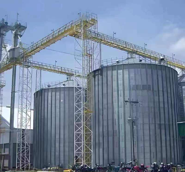 粮食从收割后通过汽车运输经过过磅、扞样、检验、烘干后进入投料口卸料,然后通过提升机进入清粮筛清除粮食杂质,以提高粮食的清洁度并达到标准的洁净要求,然后把干净的粮食通过提升机提入粮仓,粮仓由仓内通风系统进行通风,测温系进行温控检测,保证粮食的安全储存。恒丰智能钢板仓的优点是模块化生产,到现场占用客户场地少,单件组装式,可实现多点控制、互为交替、集中管理、扩展力强,采用集中控制系统,在现代化工厂向无人化又迈进了一大步,从而实现了远销国外的优势。